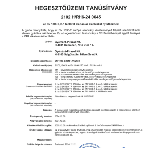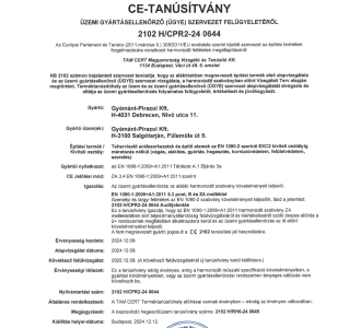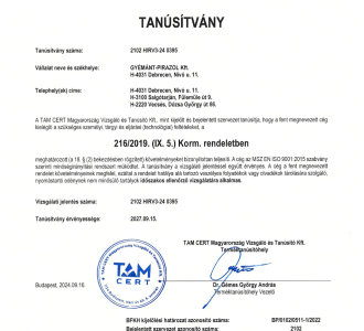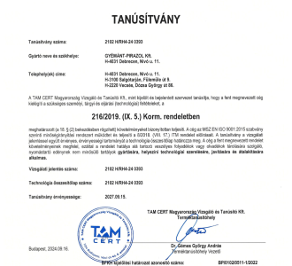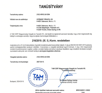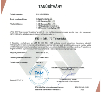 Based on the certifications from Tam Cert Hungary Testing and Certification Ltd. and TÜV Thüringen Hungary Ltd., our company is capable of manufacturing unique products according to Module G of the 8/2018. (VIII.17.) ITM decree and the 2014/68 EU directive, satisfying the production requirements and having the appropriate material and personal conditions.