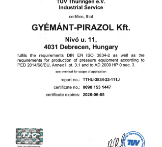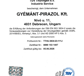 Gyémánt-Pirazol Ltd. has successfully demonstrated compliance with the AD 2000 Merkblatt HP 0 standards.