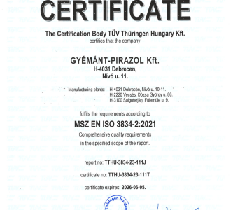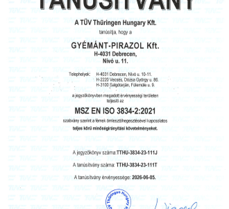 Gyémánt-Pirazol Ltd. possesses all the necessary official permits required for its operational activities. Moreover, to ensure the excellent quality of our services and products, we hold the following certifications: