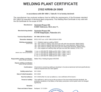 Our company meets the comprehensive quality requirements for welding according to the MSZ EN ISO 3834-2:2021 standard.